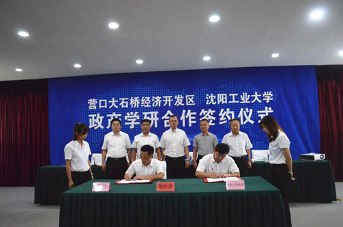 9月3日上午,我校与营口市大石桥经济开发区在营口市举行“政产学研”合作签约仪式和“政产学研合作基地”揭牌仪式。国产高清在线精品一区二区三区副校长王世杰、服务辽宁振兴工作委员会办公室主任王俭、机械工程学院副院长闫明、材料科学与工程学院副院长黄宏军、理学院副院长王威、张林楠(挂职抚顺县副县长)与营口市副市长纪朝晖、大石桥市市长韩文志、副市长袁世君、营口大石桥经济开发区领导等出席活动。