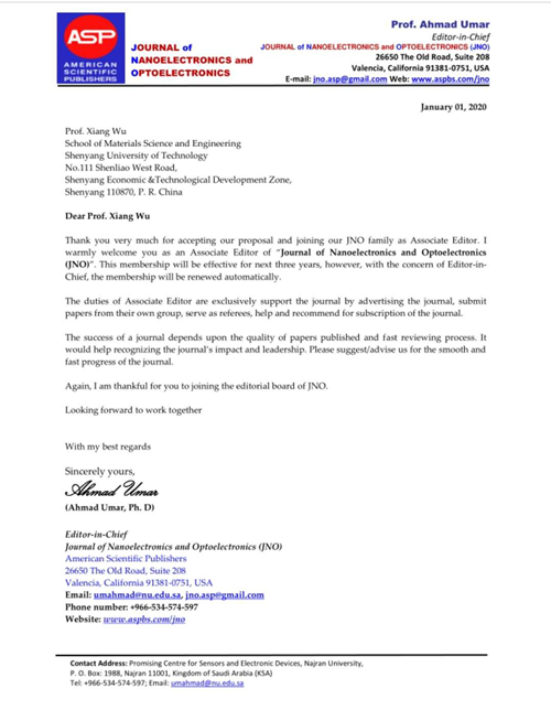 近日,应美国科学出版社邀请,我校材料科学与工程学院武祥教授获聘《Journal of Nanoelectronics and Optoelectronics》(纳米电子学与光电子学杂志)副主编一职,任期三年。该期刊作为SCI收录的一类学科交叉领域知名学术刊物,主要刊载关于纳米电子学与光电子学材料与器件,有机、无机半导体电学和光学性能,超晶格、量子结构、集成电路、微纳制造与加工以及信息处理与光通讯等领域在实验和理论方面的最新研究成果和进展。这是武祥教授第二次出任SCI收录期刊副主编之职。早在2019年,武祥教授就已获聘美国科学出版社主办的另一SCI收录期刊《Science of Advanced Materials》(先进材料科学)副主编。武祥教授两次应邀担任具有国际影响力期刊编委的重要职务,对我校材料学科建设和国际学术声誉提升带来了积极影响,为一流学科建设中标志性成果的产出做出了重要贡献。