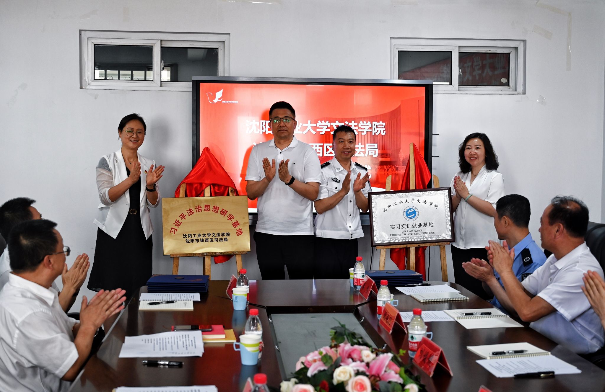 签约仪式上,文法学院院长王睿和铁西区司法局党组书记、局长孙成军分别代表双方单位签署战略合作协议。赵璟和杨鑫雨为习近平法治思想研学基地和实习实训就业基地揭牌,并分别为双方受聘人员颁发聘书。