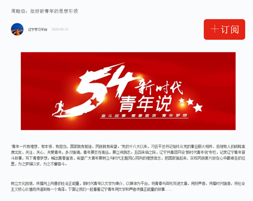 近日,学习强国辽宁学习平台以《做好新青年的引领》为题,报道了我校经济学院辅导员周翰伯老师。文中指出,在五四来临之际,辽宁共青团开设“新时代青年说”专栏,记录辽宁青年奋斗故事,写下青春梦想,喊出青春宣言,希望广大青年要树立与时代主题同心同向的理想信念,把国家强起来、实现民族复兴放在心中最神圣的位置,为之梦寐以求、为之不懈奋斗。周翰伯老师始终以做好新青年的思想引领为己任,除负责本职工作外,他长期坚持通过微团课、微党课、微网文评论等方式,向广大青年宣传正能量,引导和教育青年树立正确的价值观。他还在多个网络平台发布文章、视频等微作品百余件,获得支持评论数逾10万,通过努力,让广大青年自觉同党和国家站在一起,发自肺腑地全身心参与到中国特色社会主义事业建设中来。疫情期间,他通过网文宣传,帮助广大青年正确认识和面对疫情,教育青年学生们做好自我防护,履行公民义务,不信谣、不传谣,保持乐观心态,坚定必胜信念。