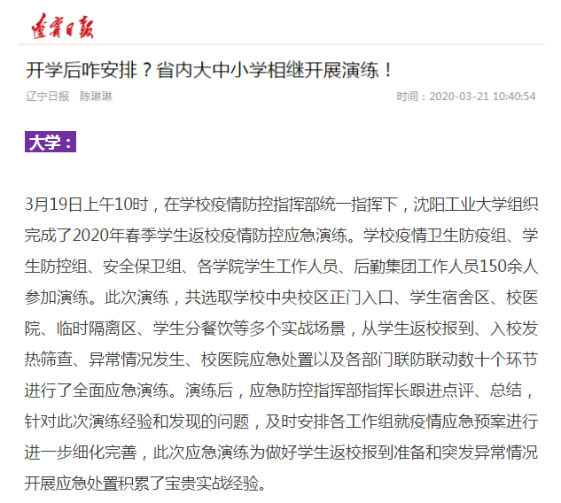 3月20日,辽宁日报客户端、东北新闻网、北国网等多家媒体平台报道了我校开展2020年春季学生返校疫情防控应急演练。报道中指出,在学校疫情防控指挥部统一指挥下,学校疫情卫生防疫组、学生防控组、安全保卫组、各学院学生工作人员、后勤集团工作人员150余人参加演练。此次演练,共选取学校中央校区正门入口、学生宿舍区、校医院、临时隔离区、学生分餐饮等多个实战场景,从学生返校报到、入校发热筛查、异常情况发生、校医院应急处置以及各部门联防联动数十个环节进行了全面应急演练。演练后,应急防控指挥部指挥长跟进点评、总结,针对此次演练经验和发现的问题,及时安排各工作组就疫情应急预案进行进一步细化完善,此次应急演练为做好学生返校报到准备和突发异常情况开展应急处置积累了宝贵实战经验。