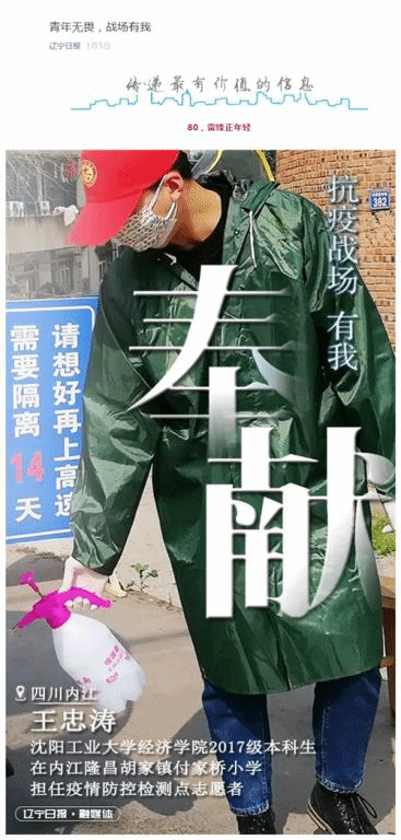 3月5日,《辽宁日报》以“青年无畏 战场有我”为题,报道了我校学生王忠涛等多名辽宁大学生,义无反顾的冲向疫情防控最前线,用无畏、果敢的行动,展现青年风采,履行使命担当,为90后、00后写下闪光篇章。报道中指出,王忠涛是我校经济学院2017级本科生,疫情期间在家乡担任疫情防控检测点志愿者,用主动作为诠释青年担当,用实际行动履行青年使命,值得广大学生学习。