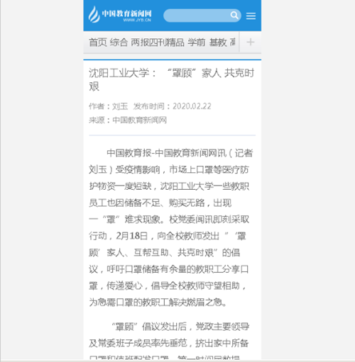 2月22日,《中国教育报》-中国教育新闻,中国新闻网辽宁频道,今日头条网站等多家媒体报道了我校“罩顾”家人爱心行动和近期疫情防控工作。文中指出,受疫情影响,市场上口罩等医疗防护物资一度短缺,国产高清在线精品一区二区三区一些教职员工出现一“罩”难求现象。校党委闻讯即刻采取行动,2月18日,向全校教师发出“‘罩顾’家人、互帮互助、共克时艰”的倡议,呼吁口罩储备有余量的教职工分享口罩,传递爱心,倡导全校教师守望相助。倡议发出后,党政主要领导及常委班子成员率先垂范,挤出家中所备口罩和值班配发口罩,第一时间尽数捐出,广大师生、校友纷纷参与和支持,为急需口罩的教职工解决燃眉之急。