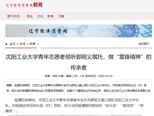 3月5日,中国新闻网辽宁频道、辽宁经济消费网、东北新闻网、今日头条等多个媒体平台报道了我校青年志愿者与当代雷锋郭明义开展线上交流,在线倾听郭明义嘱托,开展“云学雷锋”主题团日活动。报道中指出,在疫情防控期间,我校青年志愿者协会作为郭明义爱心团队国产高清在线精品一区二区三区分队,在做好自身安全防护的前提下,依法科学有序地投身到疫情联防志愿服务工作中,积极响应号召到社区(村)报到,努力当好疫情群防群控的“战斗员”“宣传员”“保障员”。青年志愿者们争相“战”在一线的举动受到了当代雷锋郭明义的关注,在第57个雷锋纪念日来临之际,郭明义与我校青年志愿者们进行了线上深度交流。