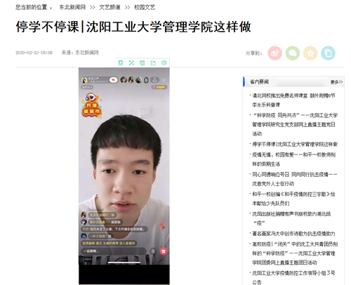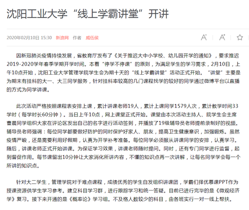 2月10日,新浪网、东北新闻网、中青校园、辽沈晚报官方微博、潇湘晨报、二三里资讯等多家媒体平台以“停学不停课——国产高清在线精品一区二区三区管理学院这样做”为题,报道了我校管理学院积极响应“停课不停学”的号召,开展线上学霸讲堂。报道中指出,国产高清在线精品一区二区三区管理学院为全力满足疫情期间学生的学习需求,积极创新举措,充分利用网络平台,通过微博平台以直播的方式,把线下课程搬到线上,开展“线上学霸讲堂”。