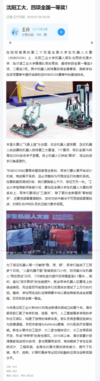 辽望·辽宁日报对我校学生团队在第二十四届全国大学生机器人大赛(ROBOCON)上斩获4项全国一等奖进行报道。