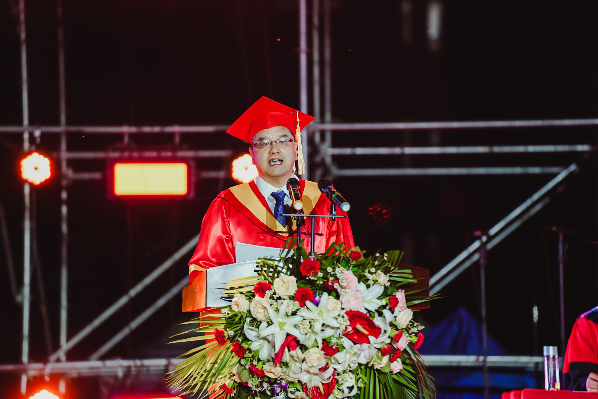 在全场热烈掌声和欢呼声下,中国工程院院士唐任远教授,党的二十大代表、大国工匠年度人物洪家光校友,校领导以及校学术委员会全体成员健步走入会场。党委副书记赵璟主持毕业典礼。
