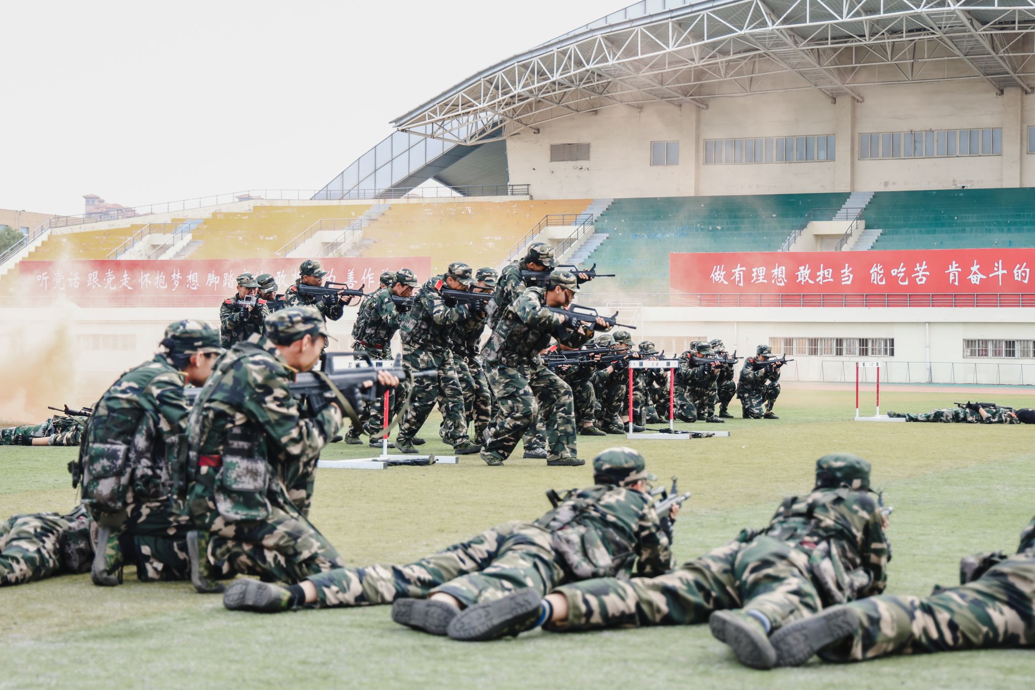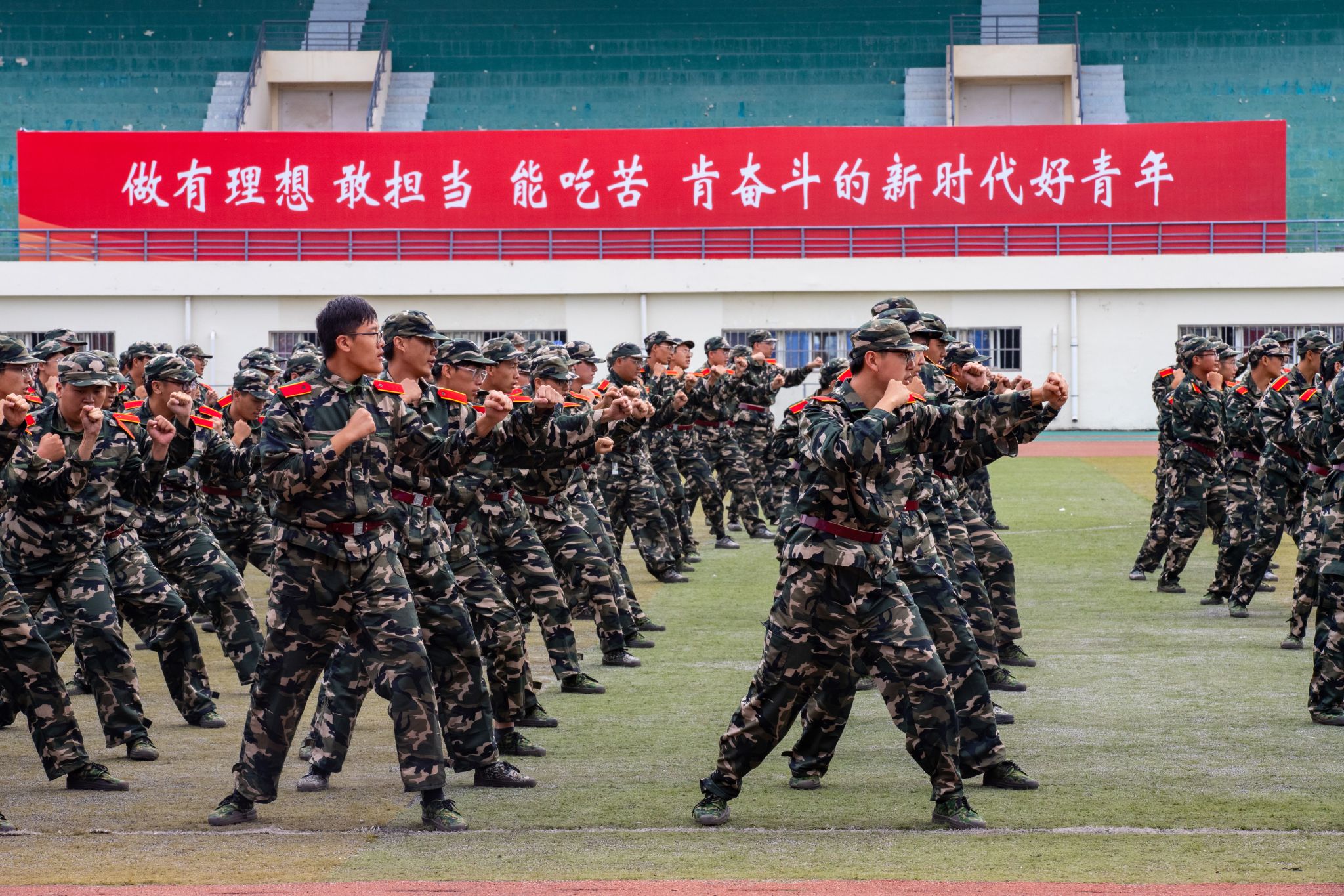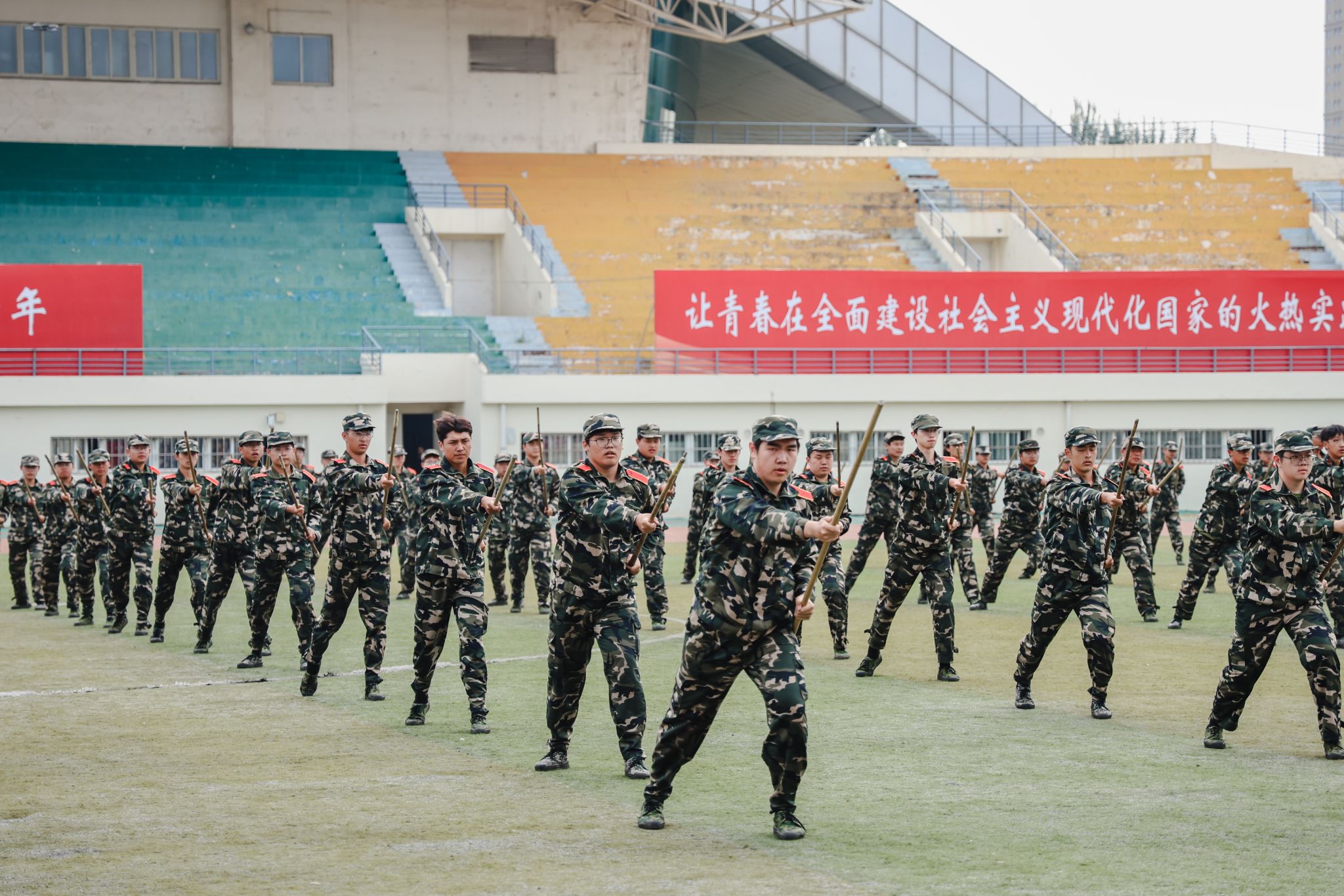 两千多名参训学员进行了刺杀操、擒敌拳、应急棍、匕首操、军体拳、擒拿格斗、战术、爱国爱校操等军训科目表演。他们精神抖擞,英姿勃发,一招一式动作果断、步调一致,充分展现了入学以来的训练成果和青春朝气,不时赢得现场师生的阵阵掌声。