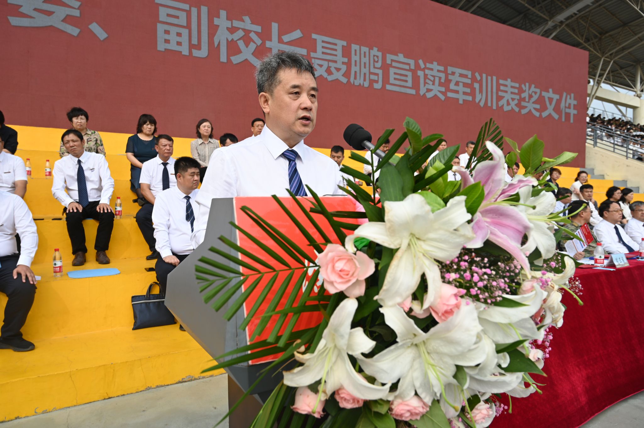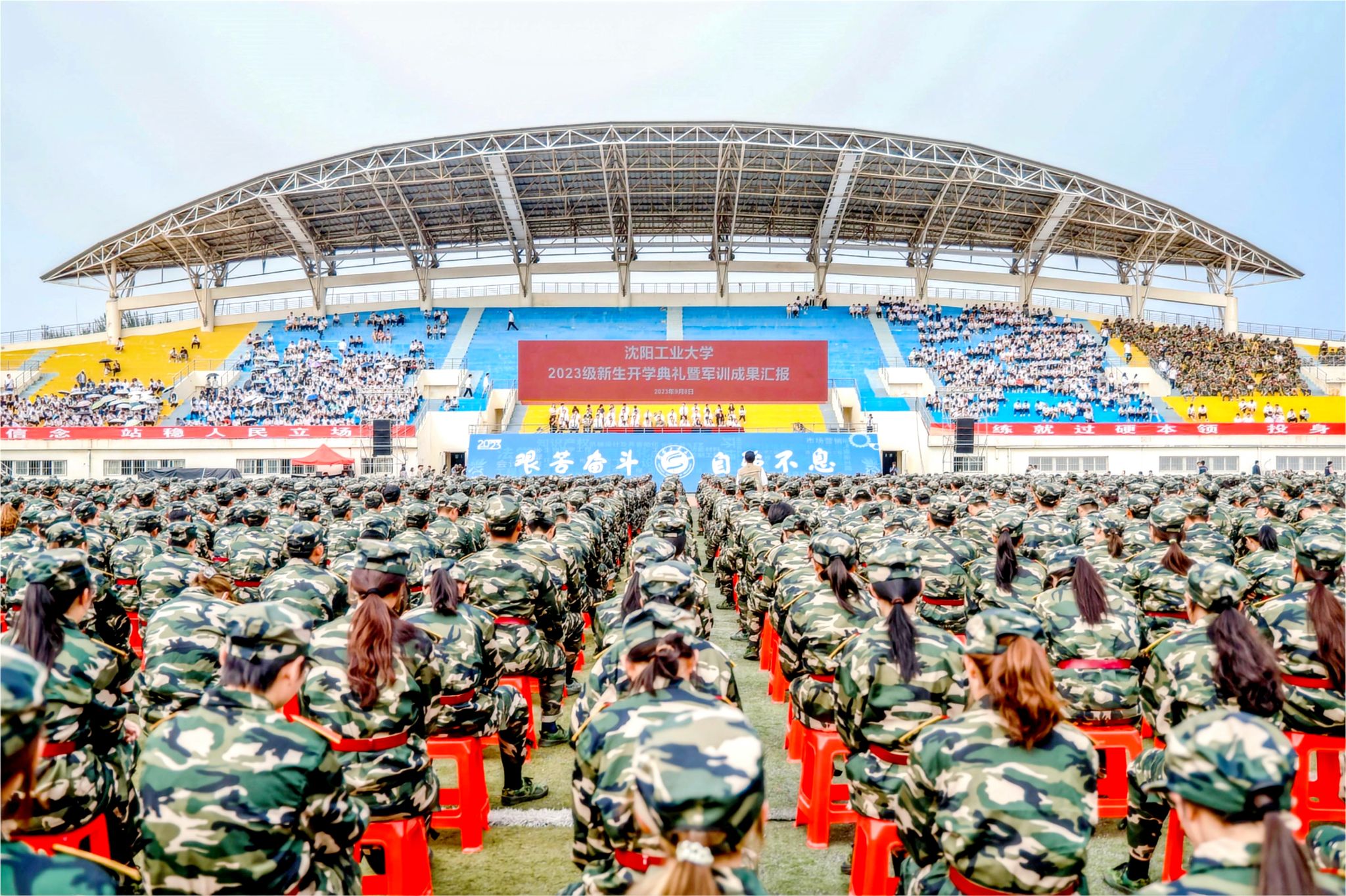 9月8日,中央校区2023级学生开学典礼暨军训成果汇报会在南区体育场举行。辽宁省军区战备建设局大校副局长黄忠文,校领导贾玉明、张珂、聂鹏、陈延明、陈卫国、柯丽、孙秋野、臧喜民出席大会,党委副书记赵璟主持会议。学校相关职能部门负责人、各二级学院党政负责人、学生工作干部、军训教官、2023级全体学生参加大会。