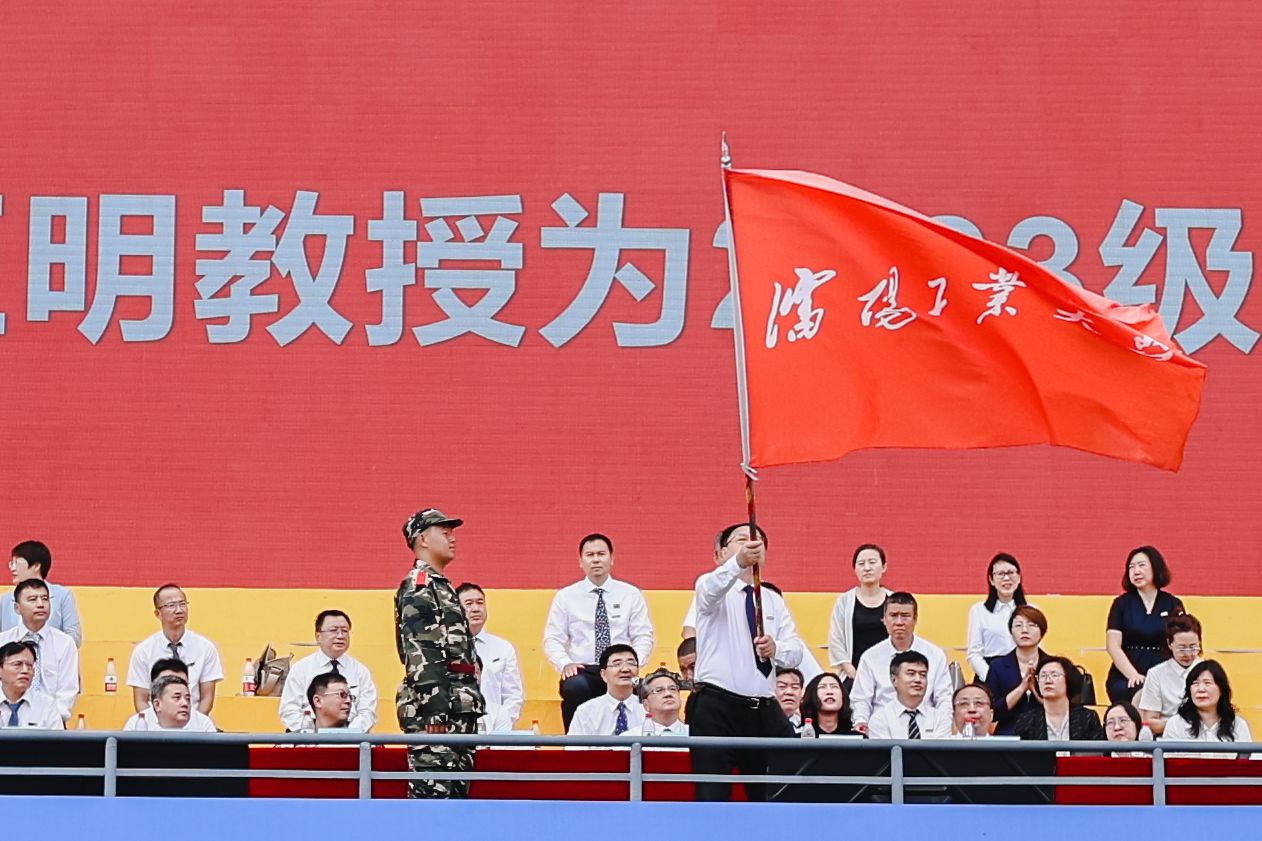典礼现场,党委书记贾玉明为2023级新生授旗。接过工大人的接力棒,同学们将继续传承工大精神、弘扬工大文化,在强国路上谱写出绚丽的青春之歌。