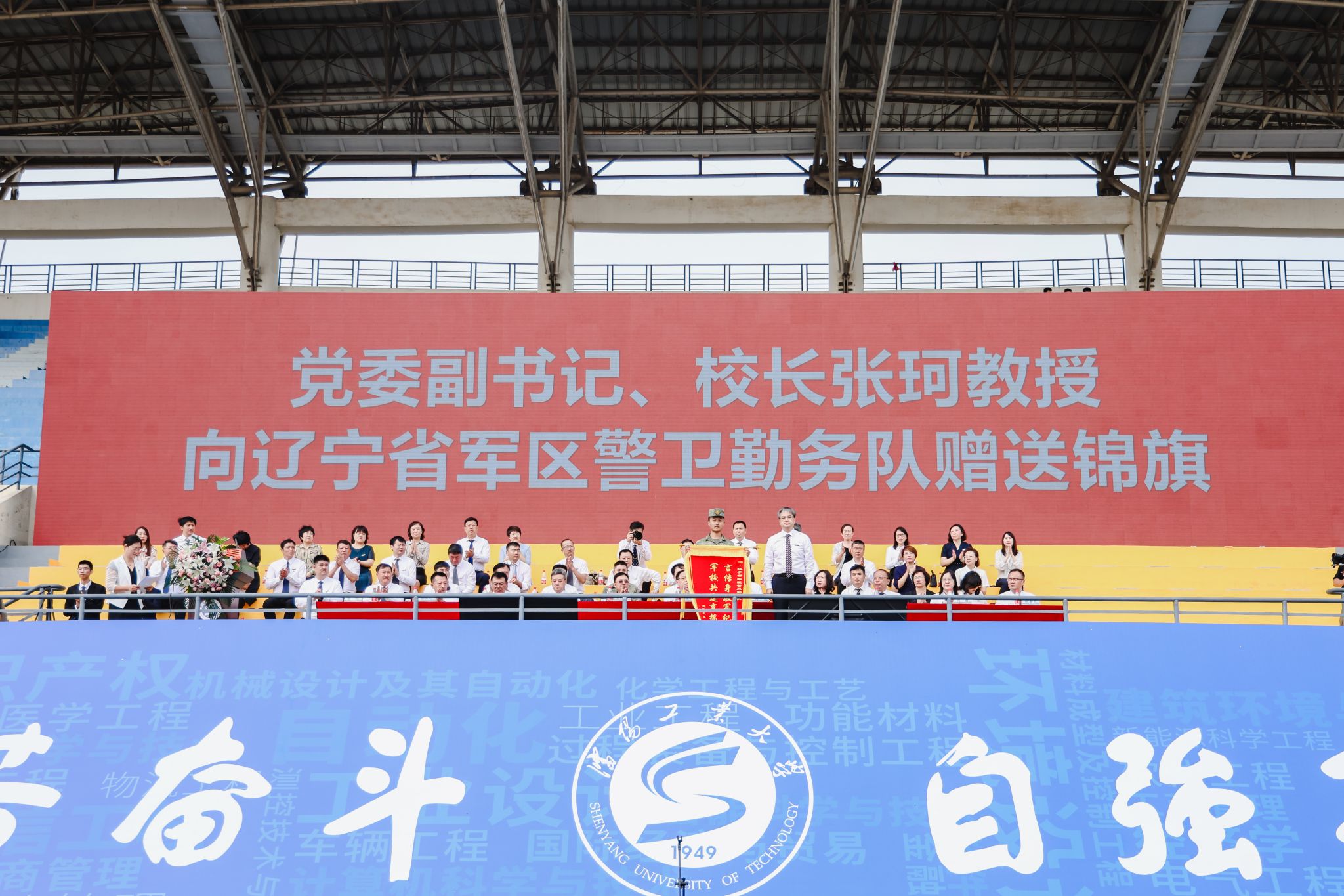 党委副书记、校长张珂向辽宁省军区警卫勤务队赠送锦旗,感谢辽宁省军区教官对学生军训工作的悉心指导。